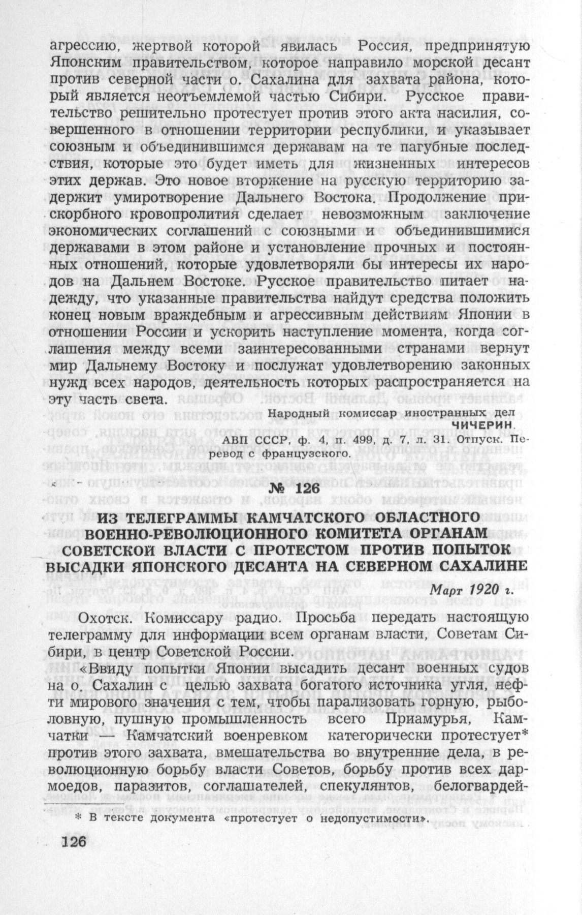 Из телеграммы Камчатского областного военно-революционного комитета органам Советской власти с протестом против попыток высадки японского десанта на Северном Сахалине. Март 1920 г.