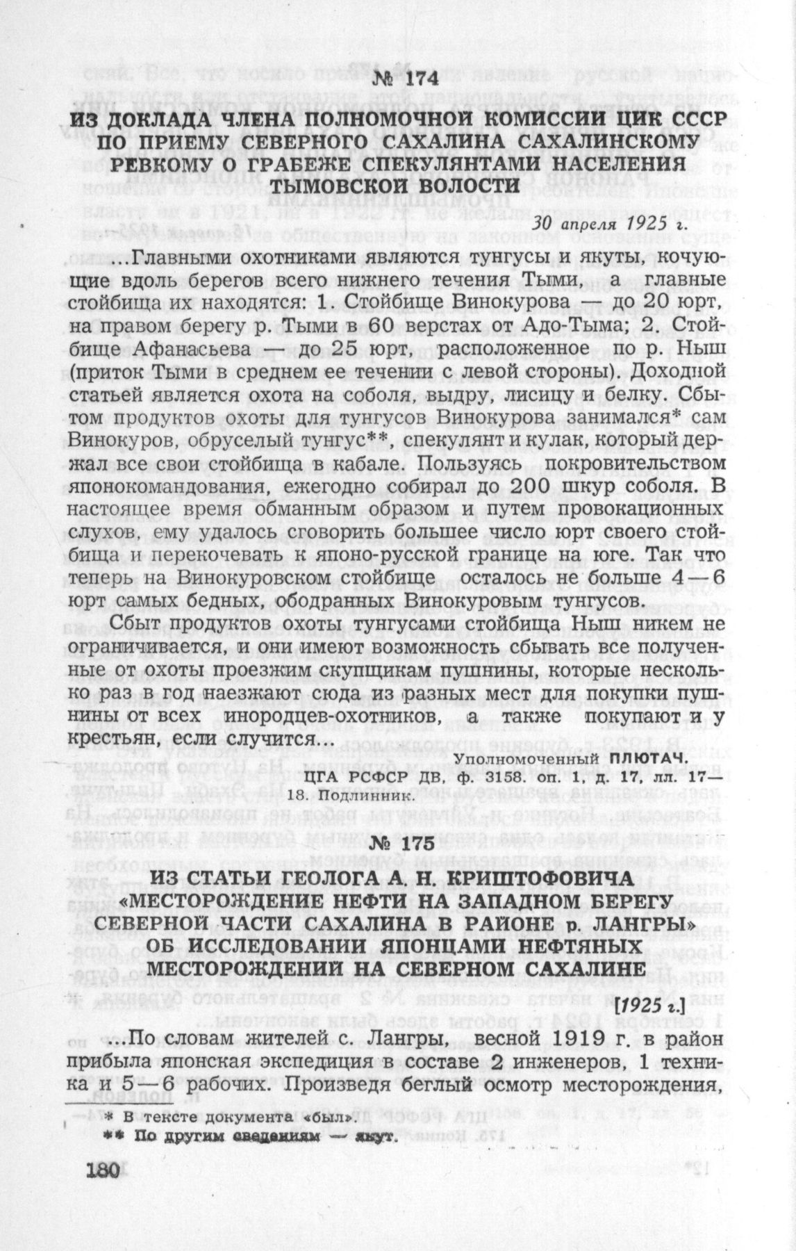 Из доклада члена Полномочной Комиссии ЦИК СССР по приему Северного Сахалина Сахалинскому ревкому о грабеже спекулянтами населения Тымовской волости. 30 апреля 1925 г. // ЦГА РСФСР ДВ, ф. 3158. оп. 1, д. 17, лл. 17-18. Подлинник.