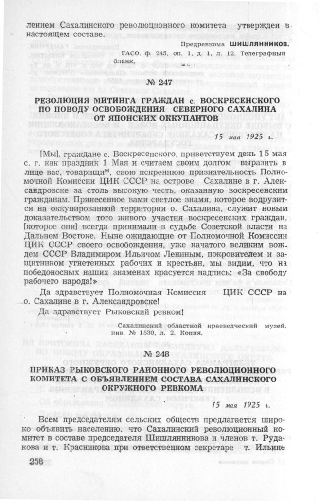 Резолюция митинга граждан с. Воскресенского по поводу освобождения Северного Сахалина от японских оккупантов. 15 мая 1925 г. // Сахалинский областной краеведческий музей, инв. № 1530, л. 2. Копия.