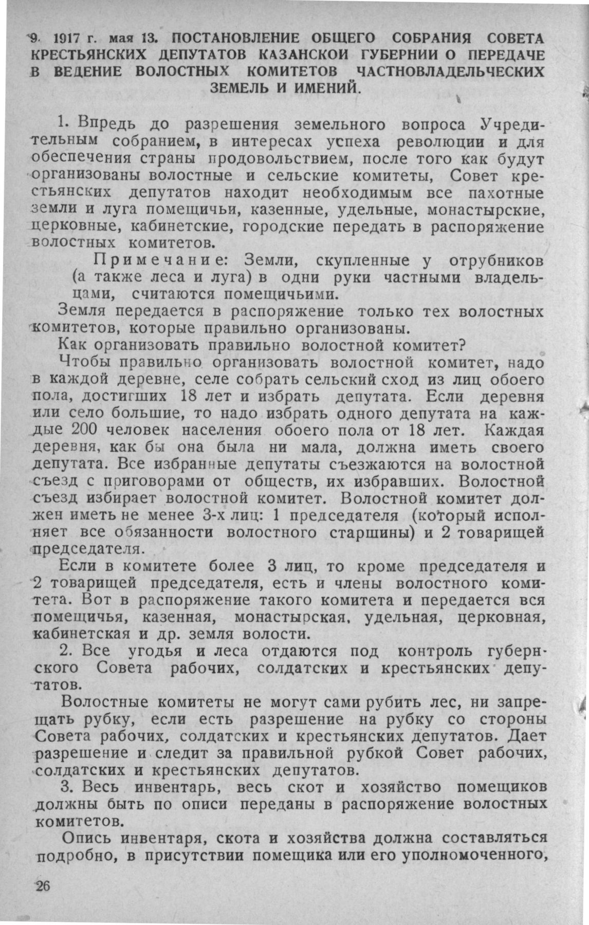 Постановление общего собрания Совета крестьянских депутатов Казанской губернии о передаче в ведение волостных комитетов частновладельческих земель и имений. 13 мая 1917 г. // ЦГА ТАССР, ф. № 98, арх. № 4, л. 20-а, 6, копия типографская.