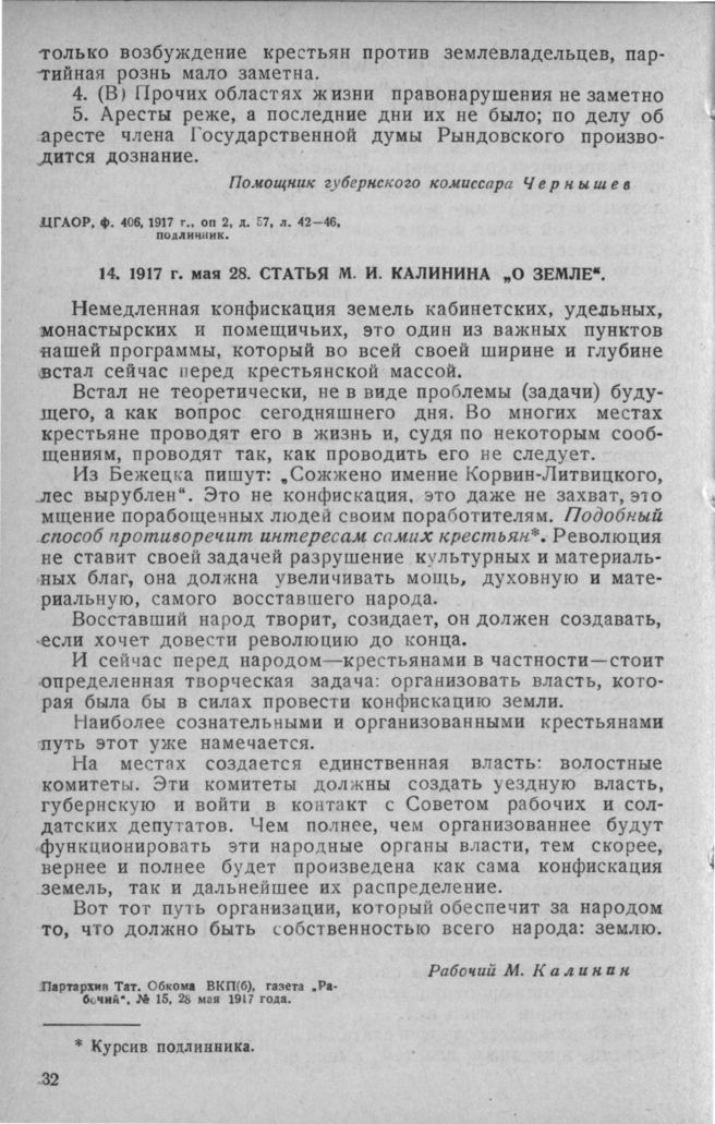 Статья М.И. Калинина „О земле". 28 мая 1917 г. // Партархив Тат. Обкома ВКП(б), газета „Рабочий". № 15, 28 мая 1917 года.