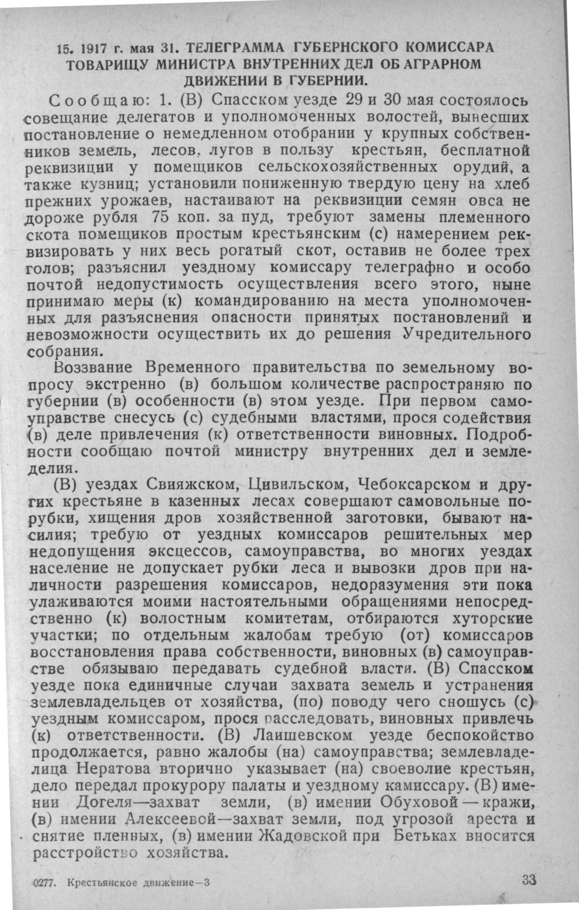 Телеграмма губернского комиссара товарищу министра внутренних дел об аграрном движении в губернии. 31 мая 1917 г.