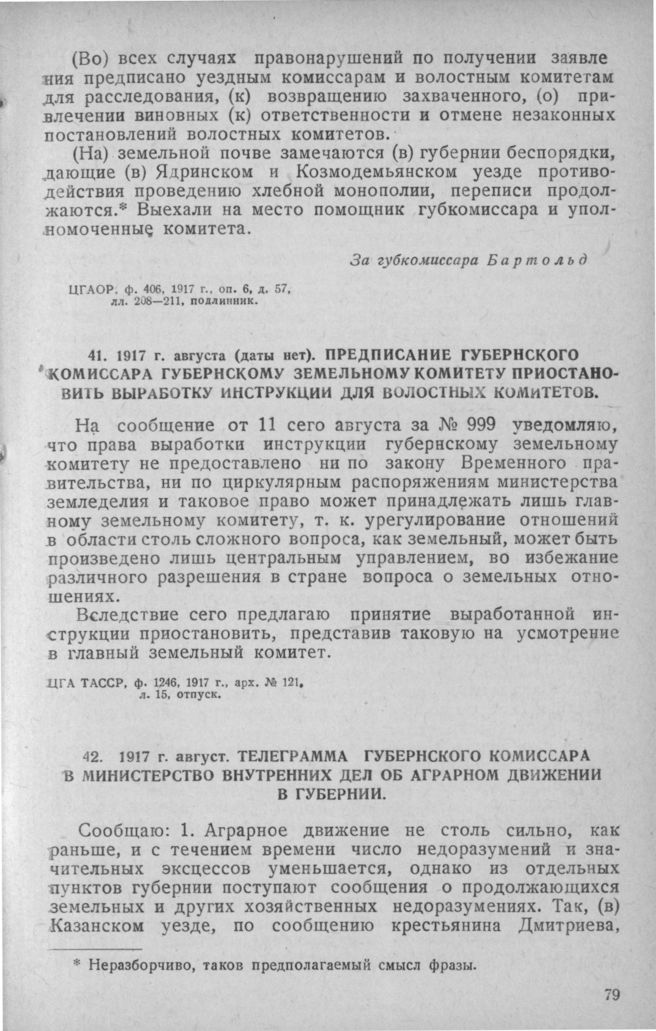 Предписание губернского комиссара губернскому земельному комитету приостановить выработку инструкции для волостных комитетов. август 1917 г.