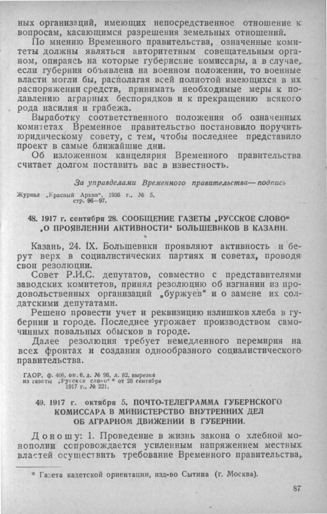Почто-телеграмма губернского комиссара в министерство внутренних дел об аграрном движении в губернии. 5 октября 1917 г. // ЦГАОР, ф. 406. 1917 г., оп. 2, д. № 57, лл. 306—309, подлинник.