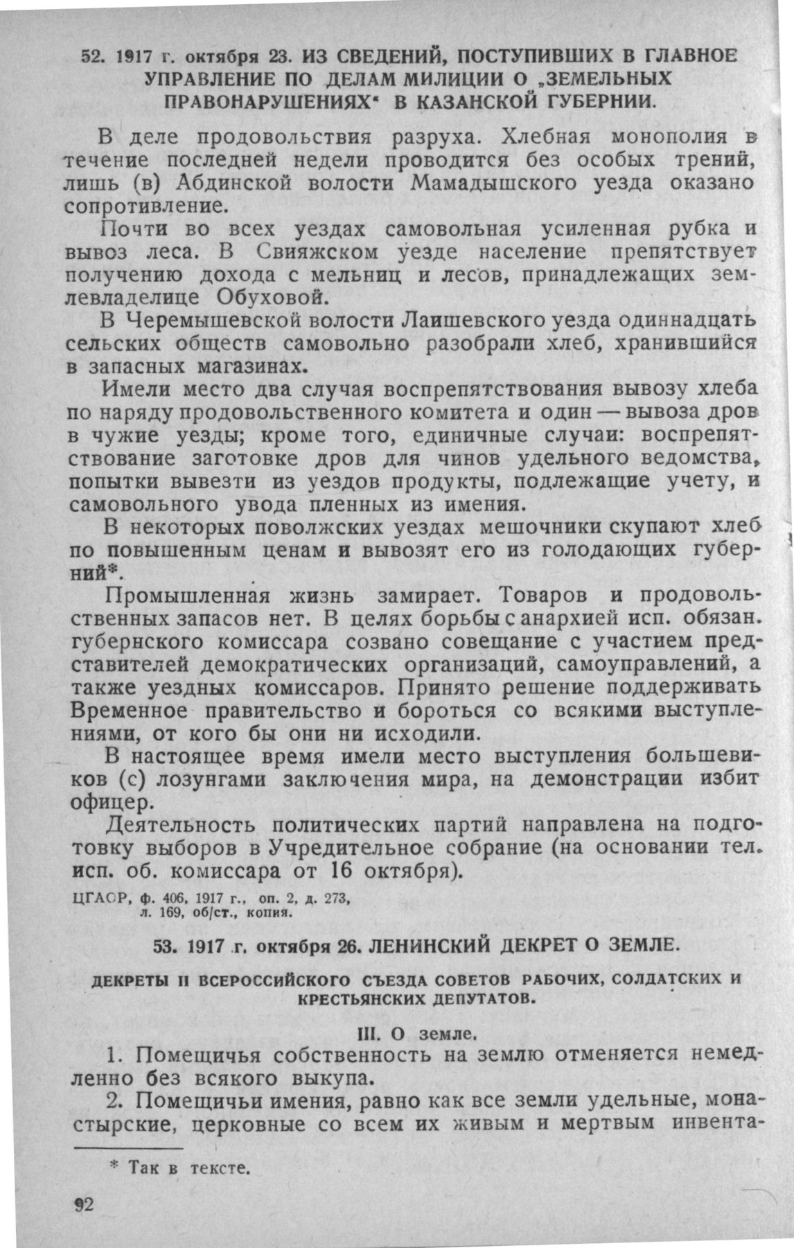 Ленинский декрет о земле. 26 октября 1917 г. // Собрание узаконений и распоряжений рабочего и крестьянского правительства, изд. 1-ое, стр. 3—5.