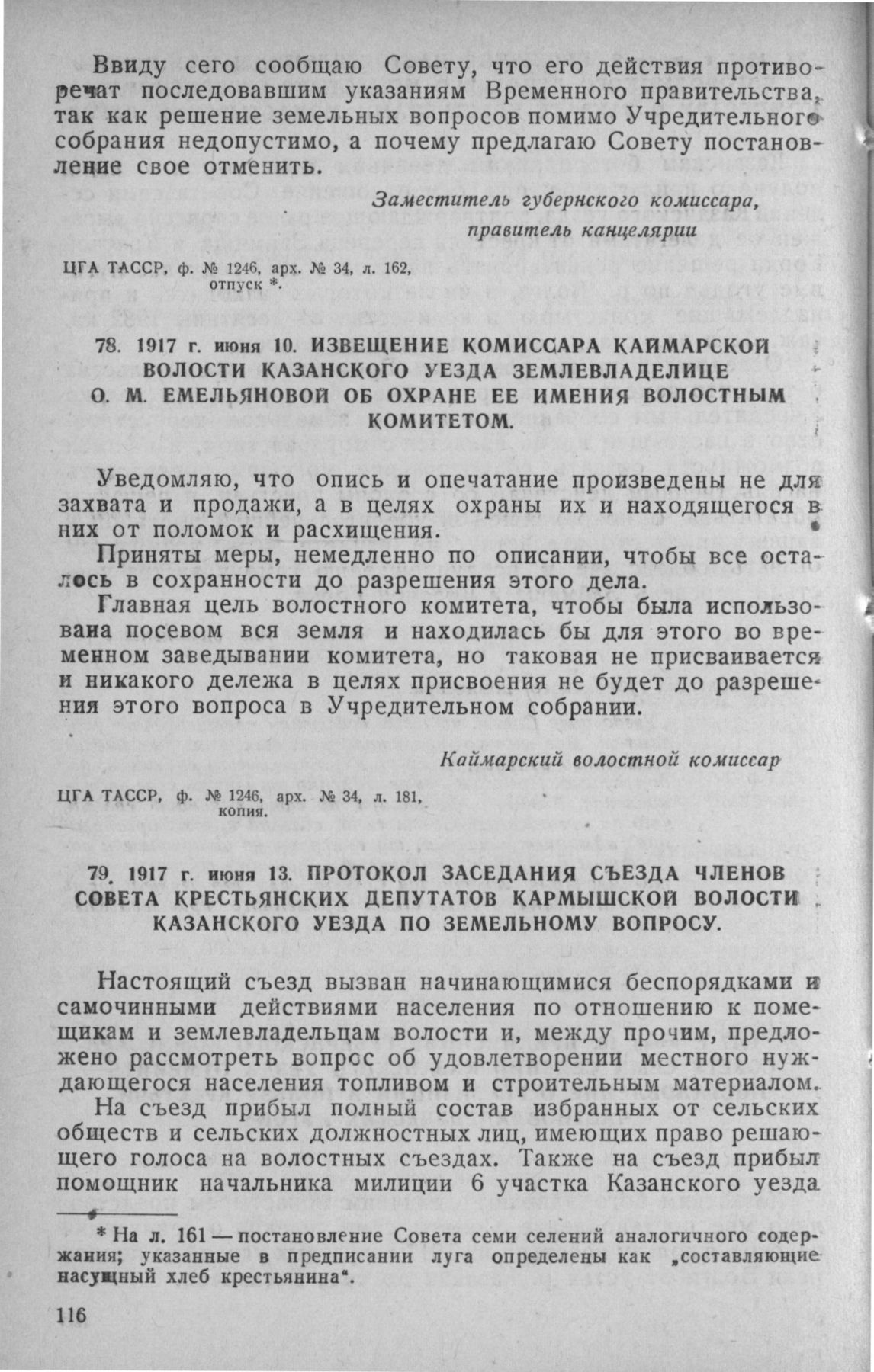 Извещение комиссара Каймарской волости Казанского уезда землевладелице О.М. Емельяновой об охране ее имения волостным комитетом. 10 июня 1917 г. // ЦГА ТАССР, ф. № 1246, арх. № 34, л. 181, копия.