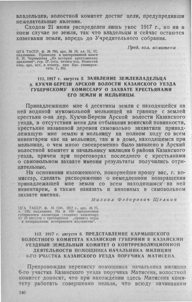 Заявление землевладельца д. Кукчи-Берези Арской волости Казанского уезда губернскому комиссару о захвате крестьянами его земли и мельницы. 5 августа 1917 г. // ЦГА ТАССР, ф. № 1246, 1917 г., арх. № 75, л. 159, подлинник.