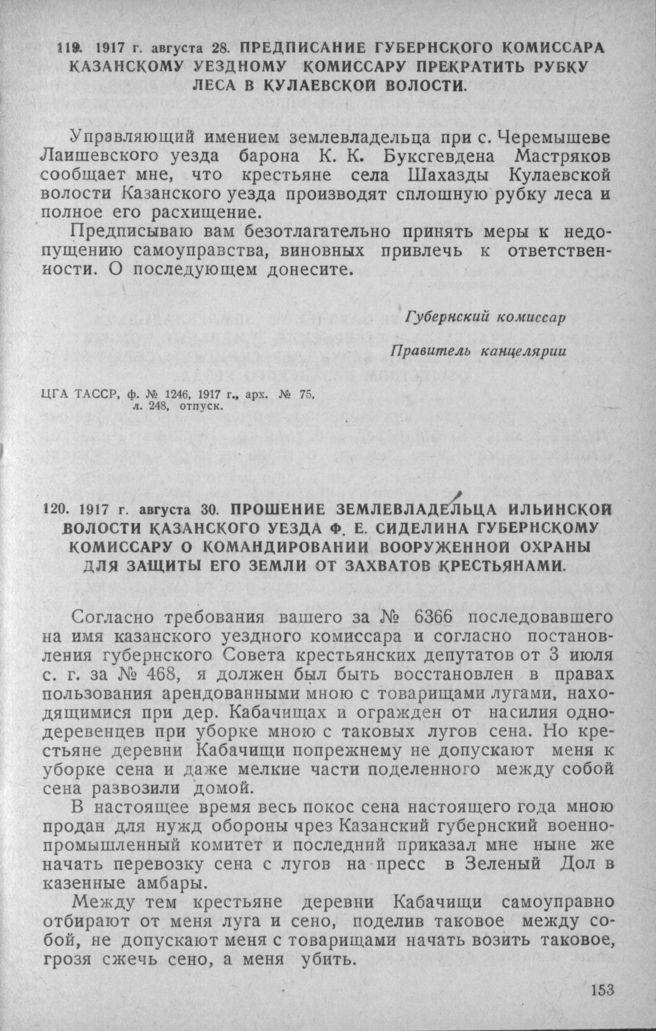 Предписание губернского комиссара Казанскому уездному комиссару прекратить рубку леса в Кулаевской волости. 28 августа 1917 г. // ЦГА ТАССР, ф. № 1246, 1917 г., арх. № 75, л. 248, отпуск.