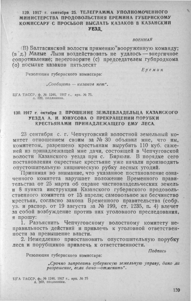 Телеграмма уполномоченного министерства продовольствия Еремина губернскому комиссару с просьбой выслать казаков в Казанский уезд. 25 сентября 1917 г. // ЦГА ТАССР, ф. № 1246, 1917 г., арх. № 75. л. 339, подлинник.