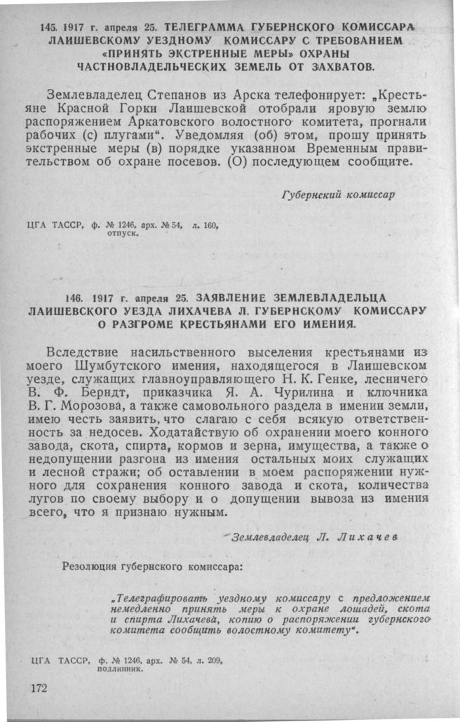 Телеграмма губернского комиссара Лаишевскому уездному комиссару с требованием «принять экстренные меры» охраны частновладельческих земель от захватов. 25 апреля 1917 г. // ЦГА ТАССР, ф. № 1246, арх. № 54, л. 160, отпуск.