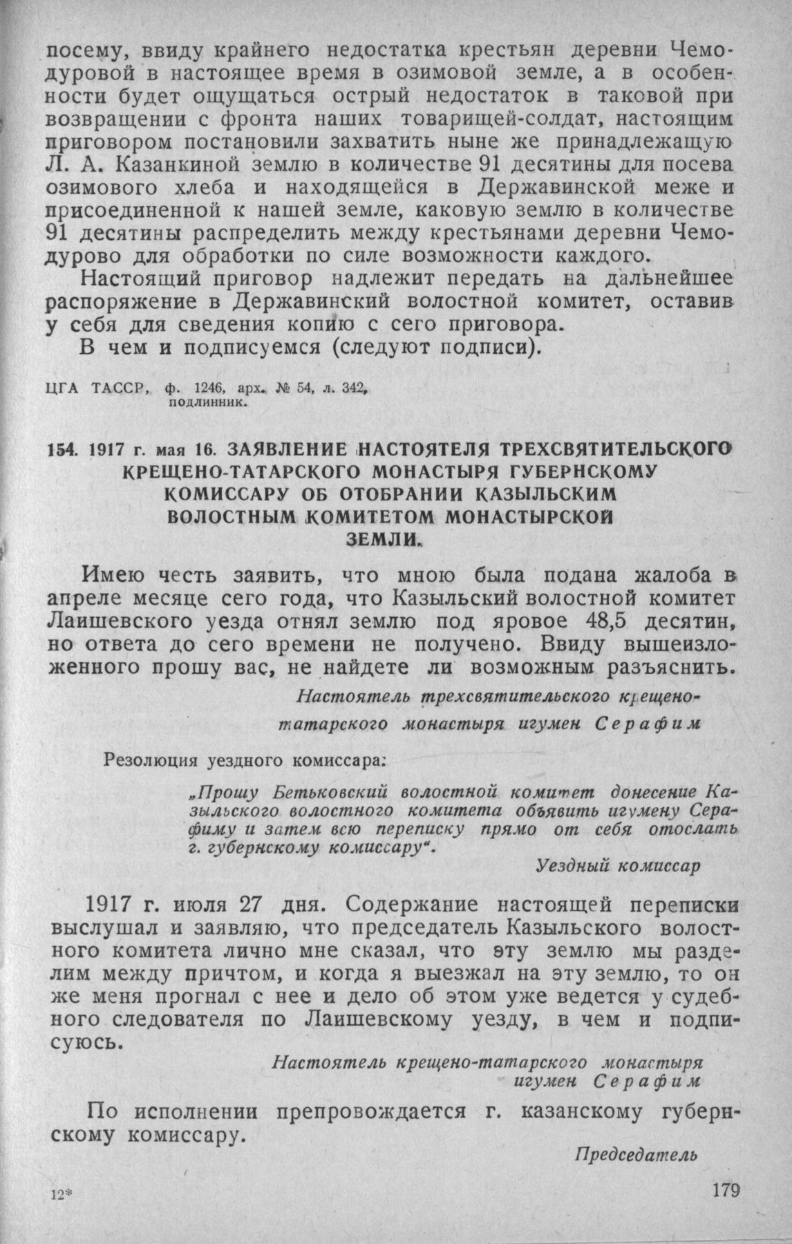 Заявление настоятеля Трехсвятительского Крещено-Татарского монастыря губернскому комиссару об отобрании Казыльским волостным комитетом монастырской земли. 16 мая 1917 г. // ЦГА ТАССР, ф. № 1246, арх. № 37, лл. 272, 273, подлинник.