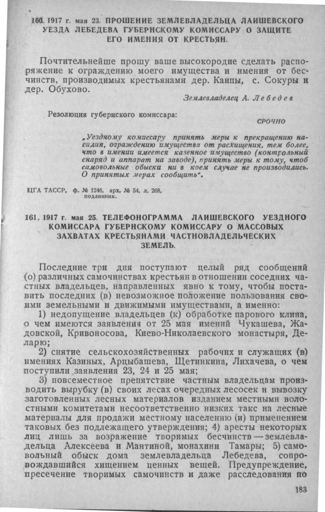 Прошение землевладельца Лаишевского уезда Лебедева губернскому комиссару о защите его имения от крестьян. 23 мая 1917 г. // ЦГА ТАССР, ф. № 1246, арх. № 54, л. 268, подлинник.