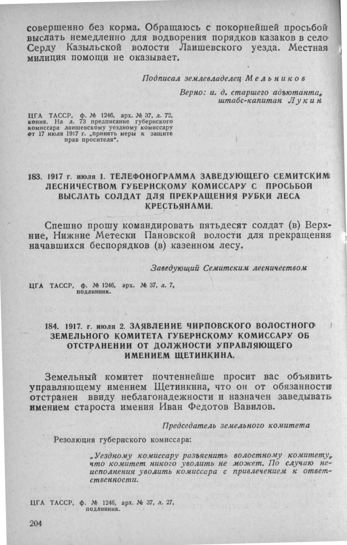 Телефонограмма заведующего Семитским лесничеством губернскому комиссару с просьбой выслать солдат для прекращения рубки леса крестьянами. 1 июля 1917 г. // ЦГА ТАССР, ф. № 1246, арх. № 37, л. 7, подлинник.