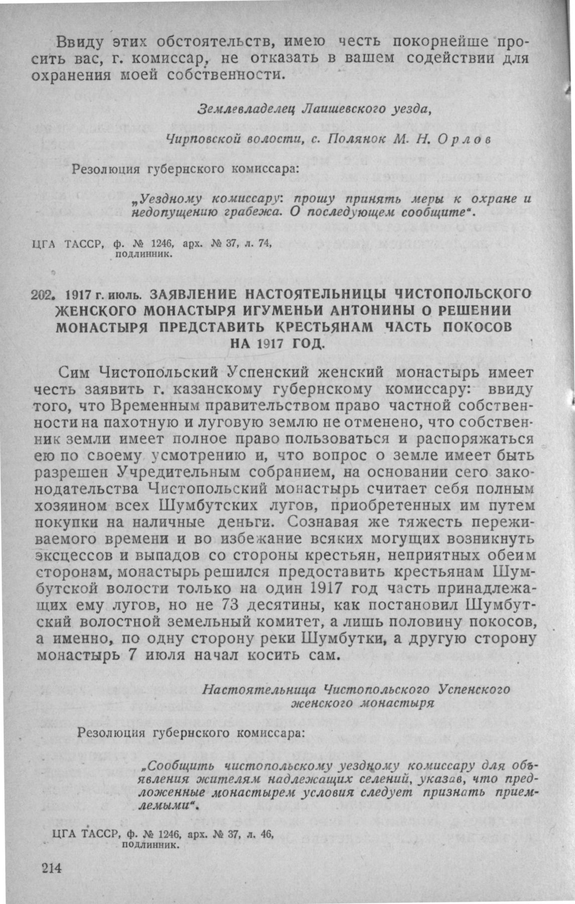 Главная Крестьянское движение в Казанской губернии накануне Великой Октябрь... Документы Заявление настоятельницы Чистопольского женского монастыря игуменьи...