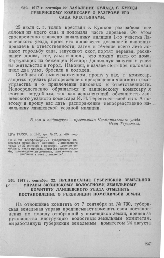 Заявление кулака с. Куюки губернскому комиссару о разгроме его сада крестьянами. 22 сентября 1917 г. // ЦГА ТАССР, ф. 1246, арх. № 37, л. 490, подлинник.