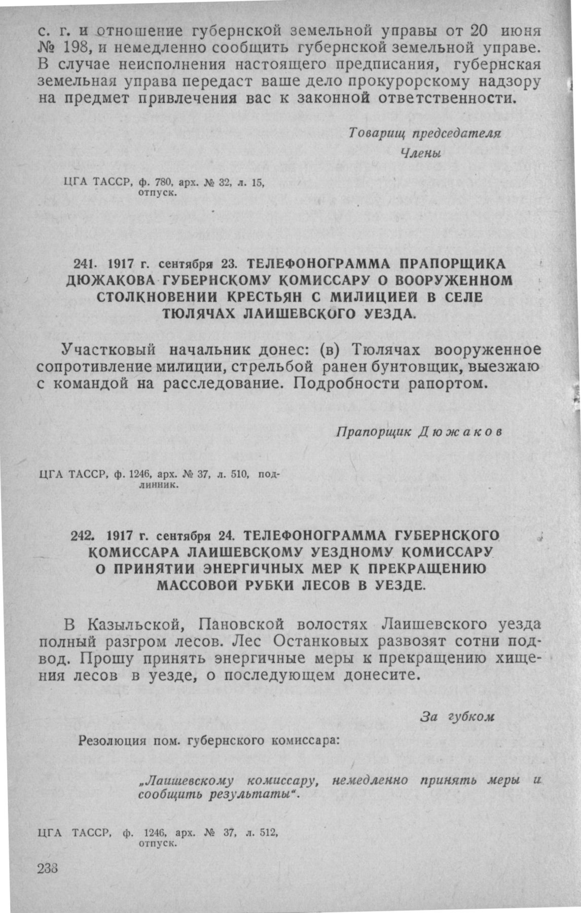 Телефонограмма прапорщика Дюжакова губернскому комиссару о вооруженном столкновении крестьян с милицией в селе Тюлячах Лаишевского уезда. 23 сентября 1917 г. // ЦГА ТАССР, ф. 1246, арх. № 37, л. 510, подлинник.