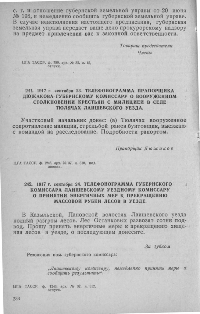 Телефонограмма губернского комиссара Лаишевскому уездному комиссару о принятии энергичных мер к прекращению массовой рубки лесов в уезде. 24 сентября 1917 г. // ЦГА ТАССР, ф. 1246, арх. № 37, л. 512, отпуск.