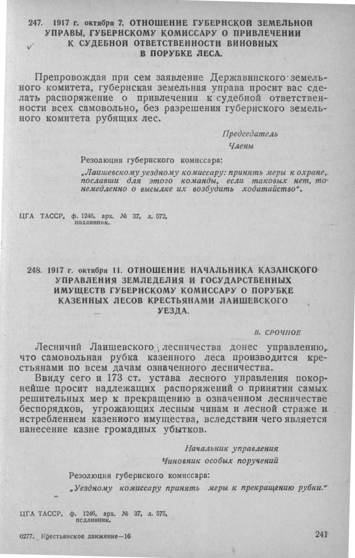Отношение начальника Казанского управления земледелия и государственных имуществ губернскому комиссару о порубке казенных лесов крестьянами Лаишевского уезда. 11 октября 1917 г. // ЦГА ТАССР, ф. 1246, арх. № 37, л. 575, подлинник.