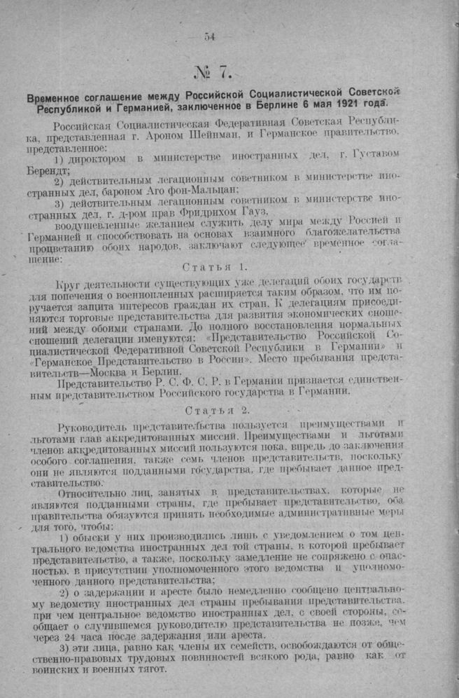 Временное соглашение между Российской Социалистической Советской Республикой и Германией, заключенное в Берлине 6 мая 1921 года // Соглашение опубликовано в Собрании Узаконений и Распоряжений Раб.-Кр. Правительства на 1921 г., № 68.