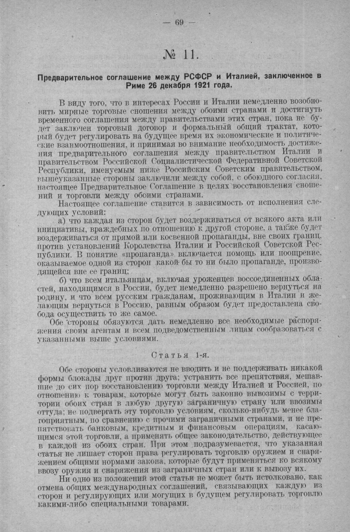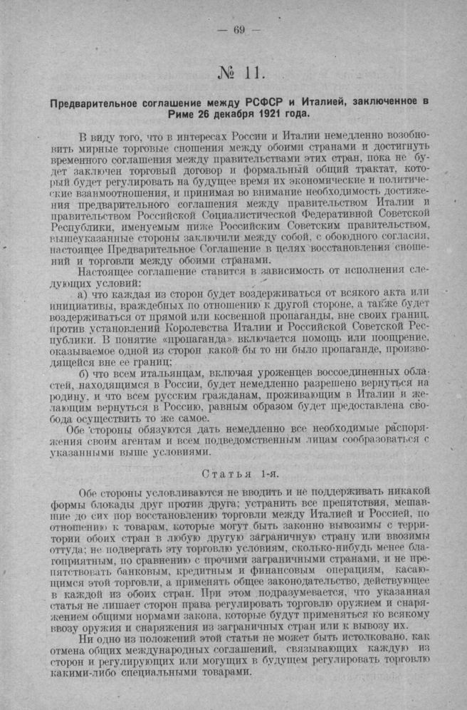Предварительное соглашение между РСФСР и Италией, заключенное в Риме и обмен нотами. 26 декабря 1921 года // Соглашение распубликовано в Собрании Узаконений и Распоряжений Рабоче-Крестьянского Правительства 1922 г., № 11.