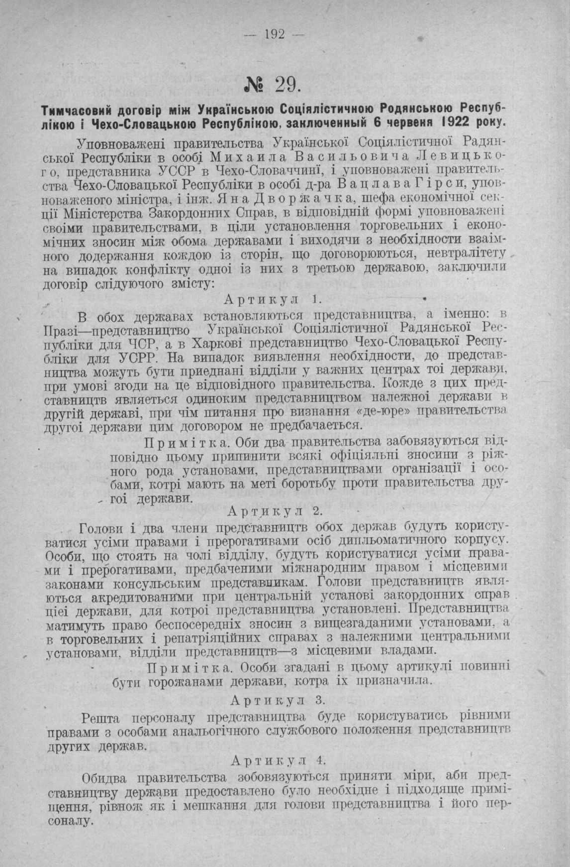 Временный договор между УССР и Чехо-Словацкой Республикой, заключенный 6 июня 1922 года = Тимчасовий дoгoвip мiж Украiнською Соцiялiстичною Родянською Республiкою i Чехо-Словацькою Республiкою, заключенный 6 червеня 1922 року