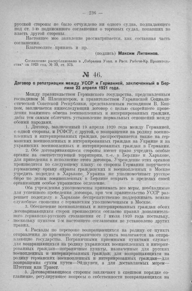 Договор о репатриации между УССР и Германией, заключенный в Берлине 23 апреля 1921 года