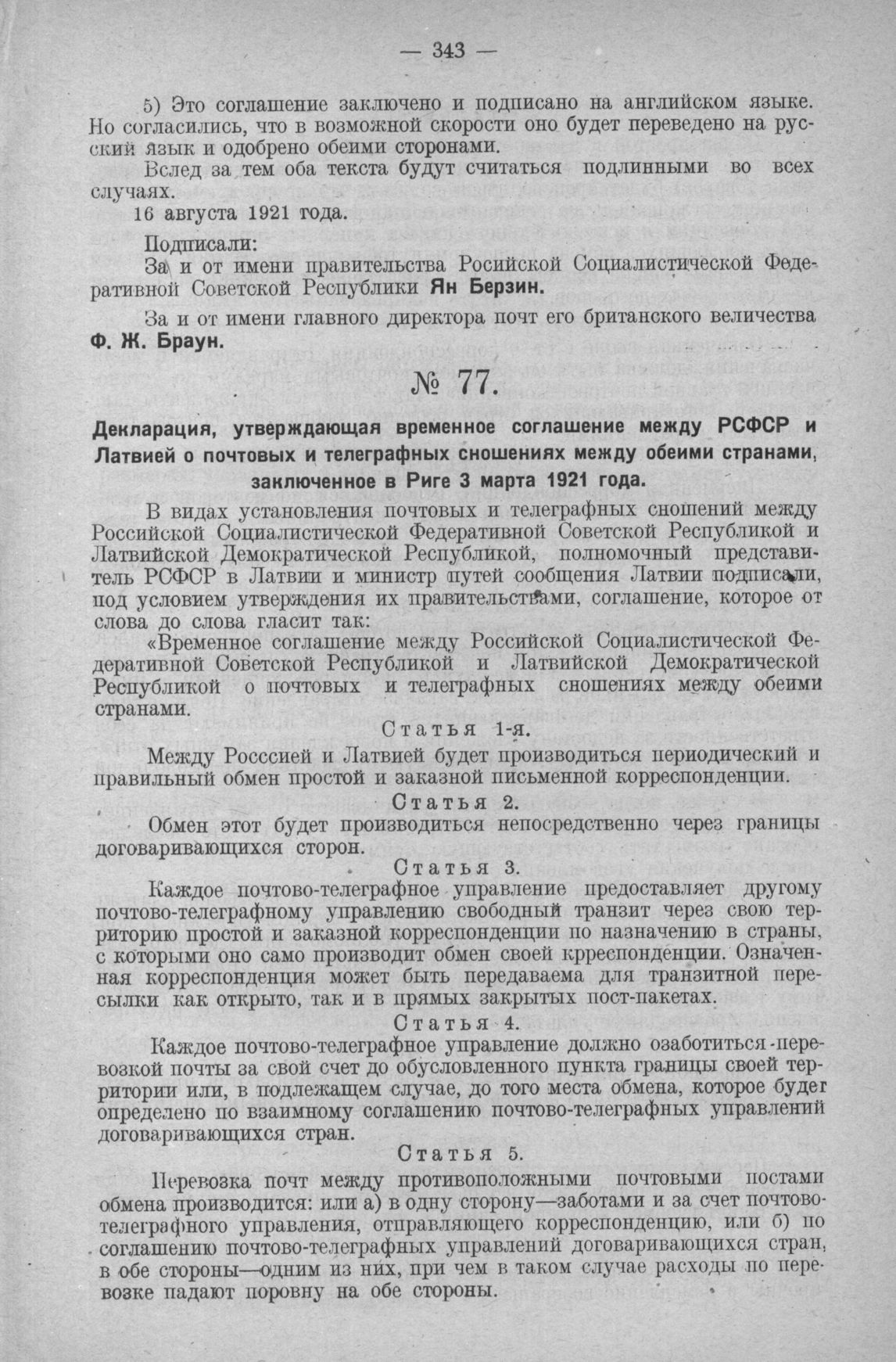 Декларация, утверждающая временное соглашение между РСФСР и Латвией о почтовых и телеграфных сношениях между обеими странами, заключенное в Риге. 3 марта 1921 года