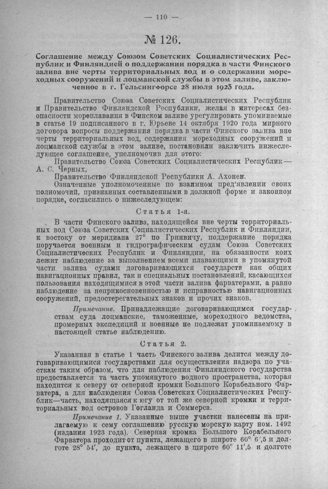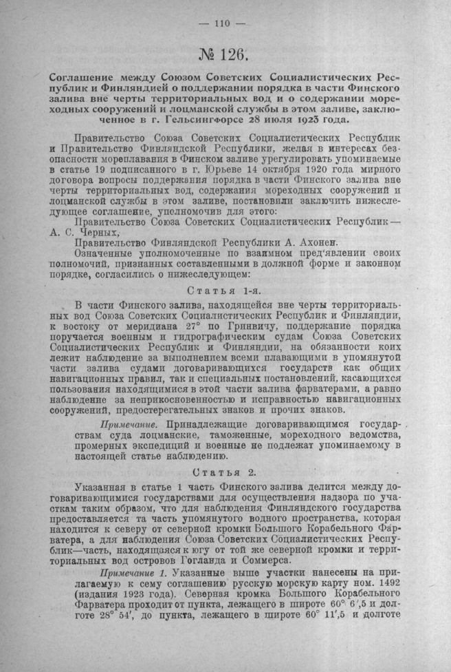 Соглашение между Союзом Советских Социалистических Республик и Финляндией о поддержании порядка в части Финского залива вне черты территориальных вод и о содержании мореходных сооружений и лоцманской службы в этом заливе, заключенное в г. Гельсингфорсе 28 июля 192З года