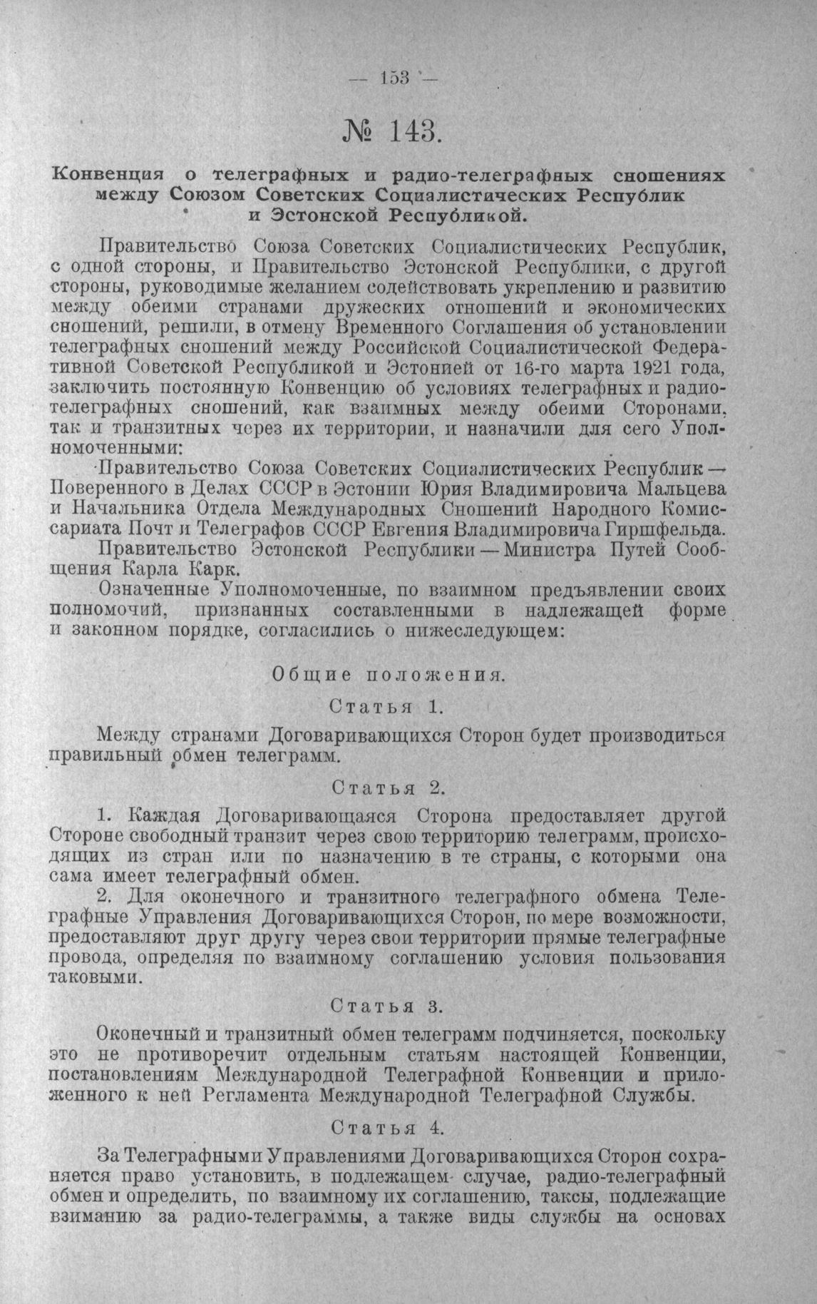 Конвенция о телеграфных и радио-телеграфных сношениях между Союзом Советских Социалистических Республик и Эстонской Республикой. 27 июня 1924 г.