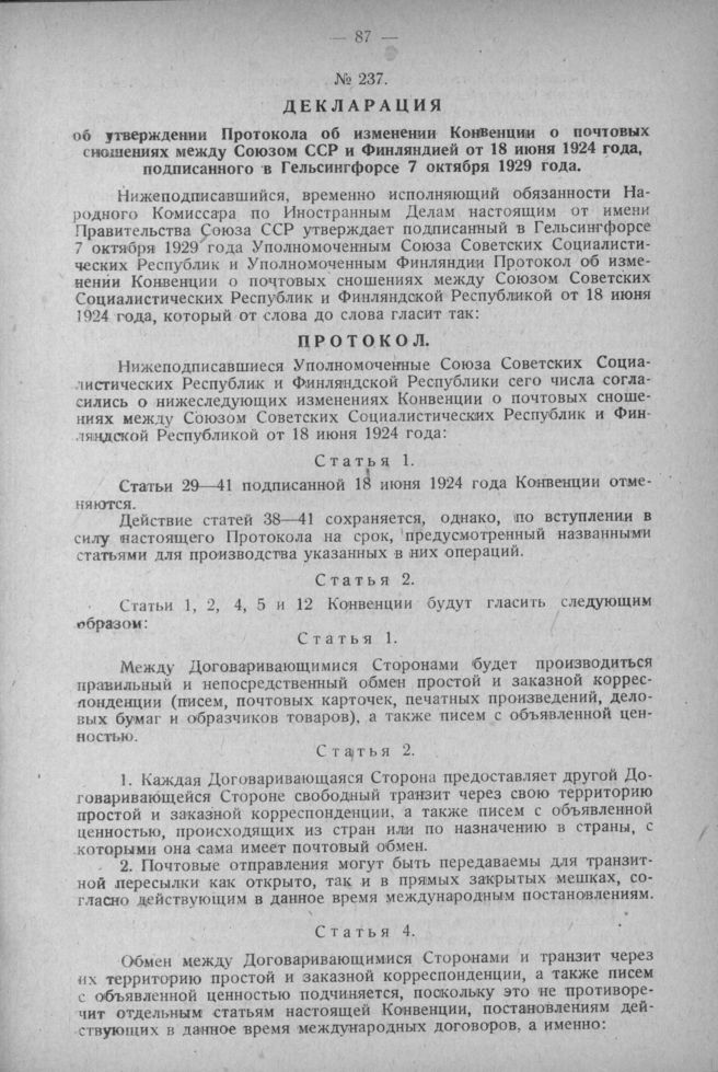 Декларация об утверждении Протокола об изменении Конвенции о почтовых сношениях между Союзом ССР и Финляндией от 18 июня 1924 года, подписанного в Гельсингфорсе 7 октября 1929 года // Распубликована в С. 3. за 1929 г. Отд. II, № 53 ст. 320.