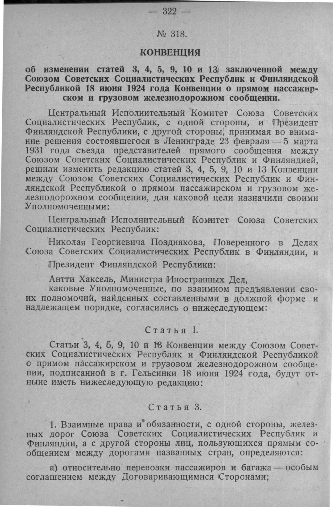 Конвенция об изменении статей 3, 4, 5, 9, 10 и 13 заключенной между Союзом Советских Социалистических Республик и Финляндской Республикой 18 июня 1924 года Конвенции о прямом пассажирском и грузовом железнодорожном сообщении. Гельсинки, 5 января 1933 года // Распубликована в Собр. Зак. 1933 г., Отд. II, № 9, ст. 120.