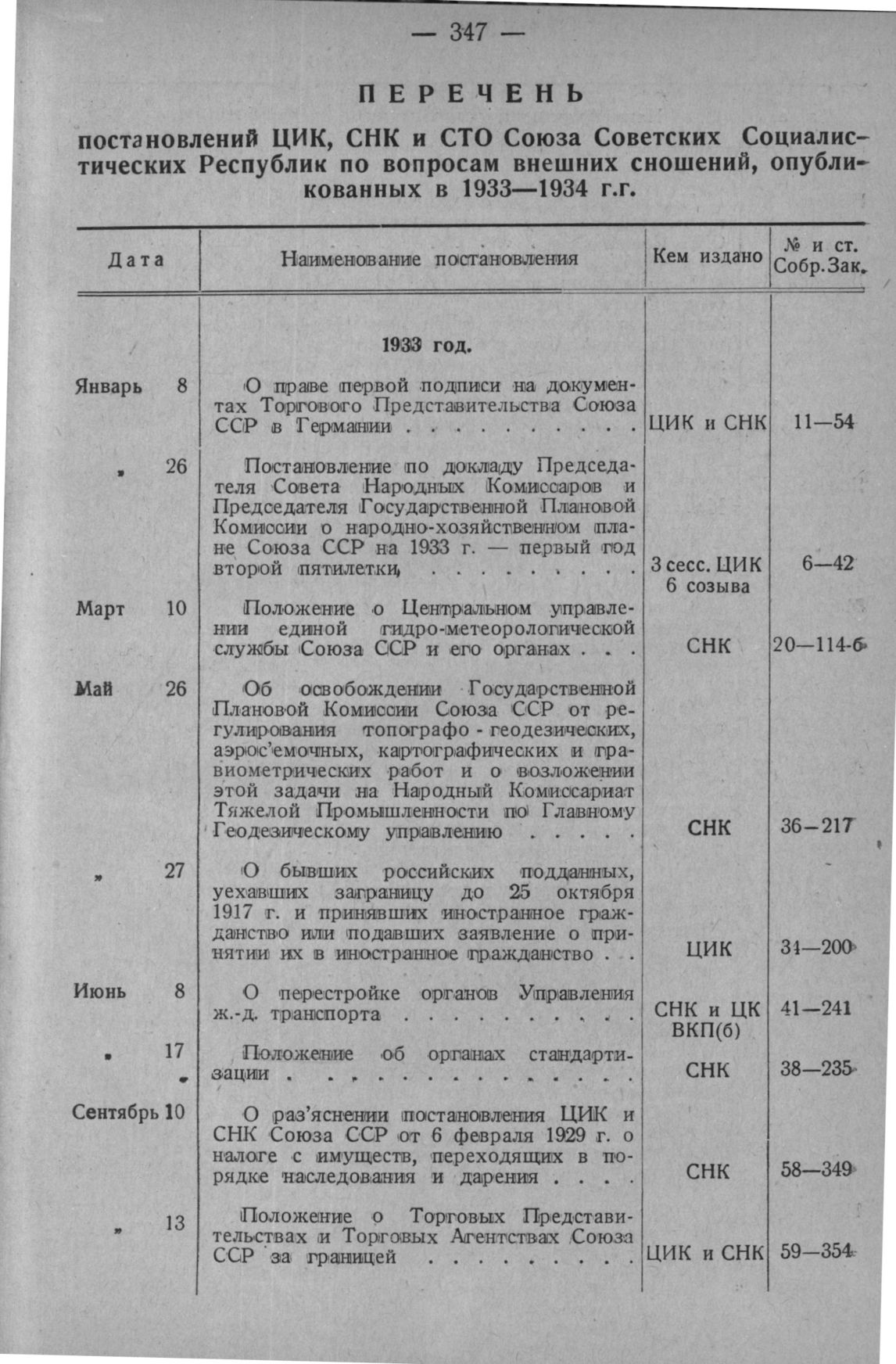Перечень постановлений ЦИК СССР, СНК СССР и СТО СССР по вопросам внешних сношений, опубликованных в 1933-1934 г. г.