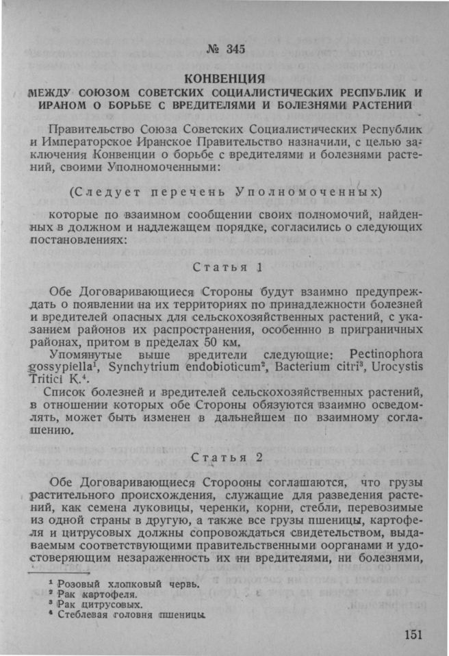 Конвенция между Союзом Советских Социалистических Республик и Ираном о борьбе с вредителями и болезнями растений. Тегеран, 27 августа 1935 года // Распубликована в Собр. Зак. за 1937 г., отд. II, № 7, ст. 36.