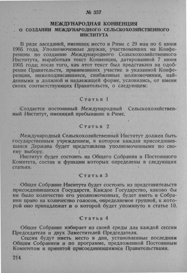 Международная Конвенция о создании международного сельскохозяйственного института. Рим, 21 апреля 1926 года