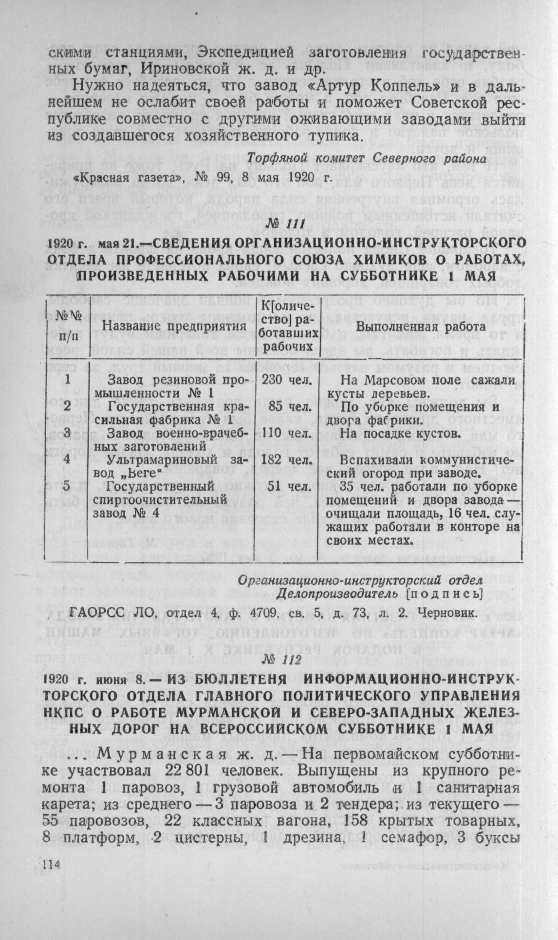 Сведения организационно-инструкторского отдела профессионального союза химиков о работах, произведенных рабочими на субботнике 1 мая. 21 мая 1920 г. // ГАОРСС ЛО, отдел 4, ф. 4709, св. 5, д. 73, л. 2. Черновик.