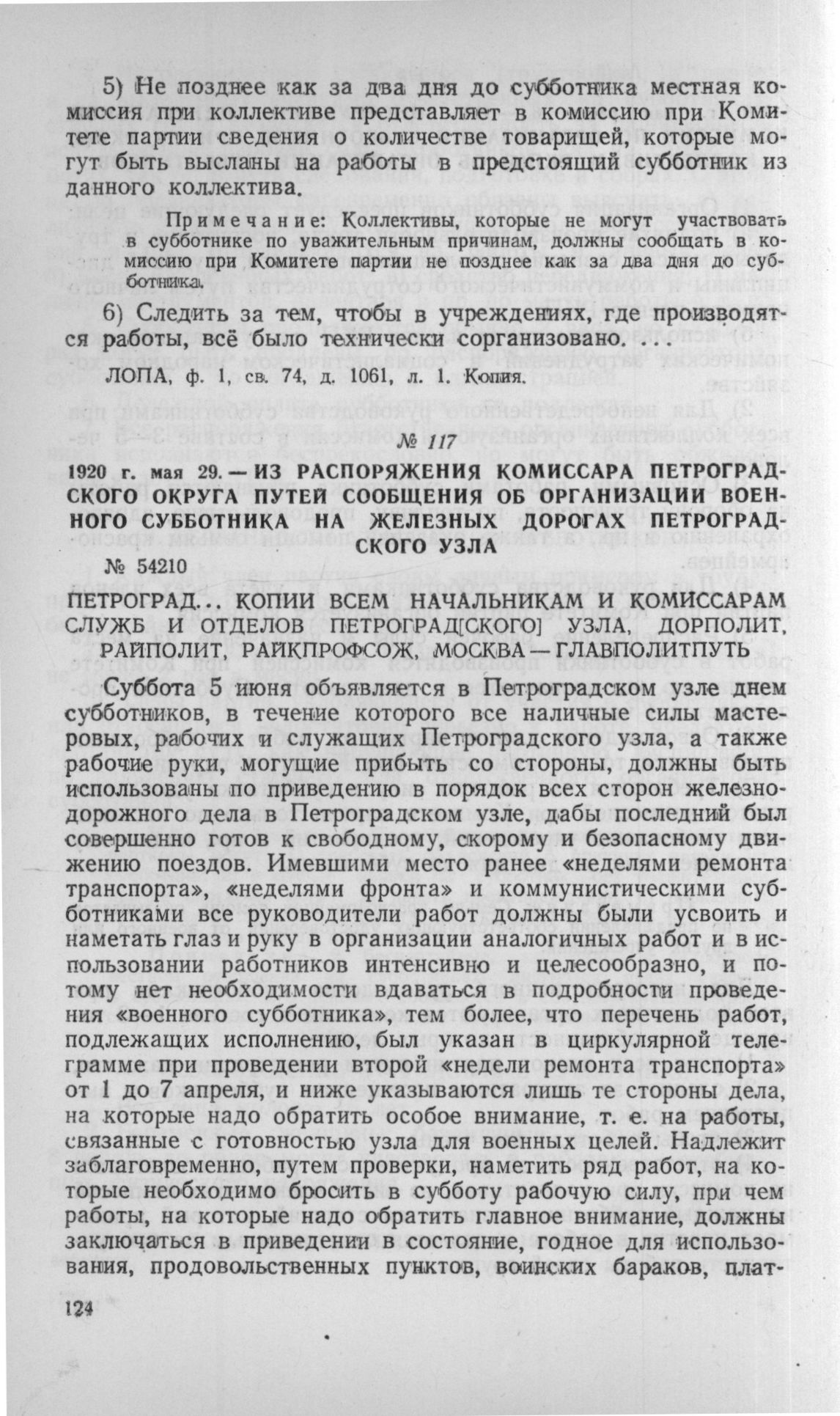 Из распоряжения комиссара Петроградского округа путей сообщения об организации военного субботника на железных дорогах Петроградского узла. 29 мая 1920 г. // ГАОРСС ЛО, отдел 4, ф. 7709, св. 24. д. 678, л. 13 и об. Копия телефонограммы.