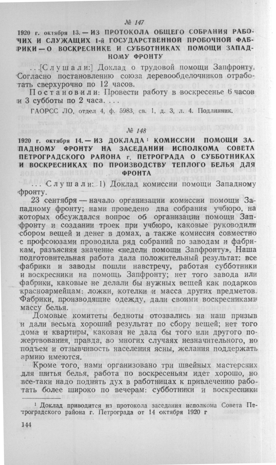 Из протокола общего собрания рабочих и служащих 1-й государственной пробочной фабрики - о воскреснике и субботниках помощи Западному фронту. 13 октября 1920 г. // ГАОРСС ЛО, отдел 4, ф. 5983, св. 1, д. 3, л. 4. Подлинник.