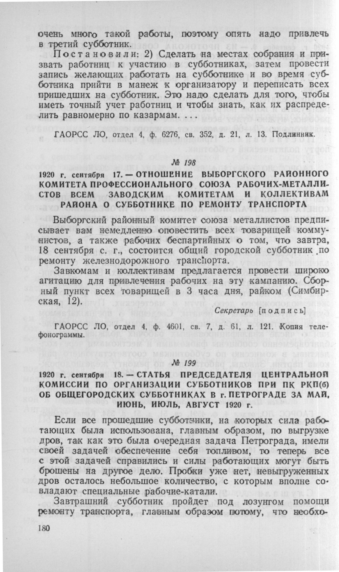 Отношение Выборгского районного комитета профессионального союза рабочих - металлистов всем заводским комитетам и коллективам. 17 сентября 1920 г. // ГАОРСС ЛО, отдел 4, ф. 4601, св. 7, д. 61, л. 121. Копия телефонограммы.