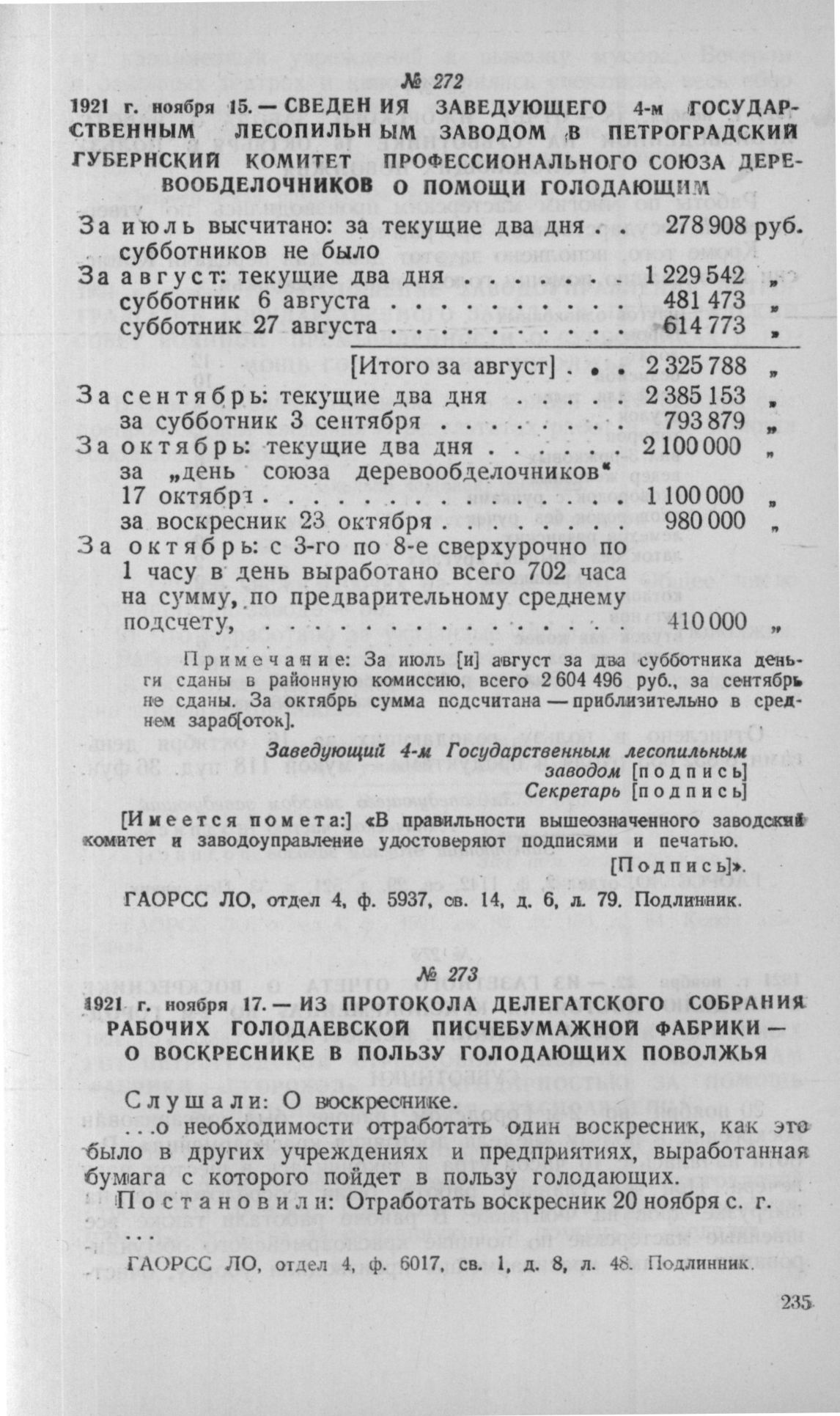 Из протокола делегатского собрания рабочих Голодаевской писчебумажной фабрики - о воскреснике в пользу голодающих Поволжья. 17 ноября 1921 г.