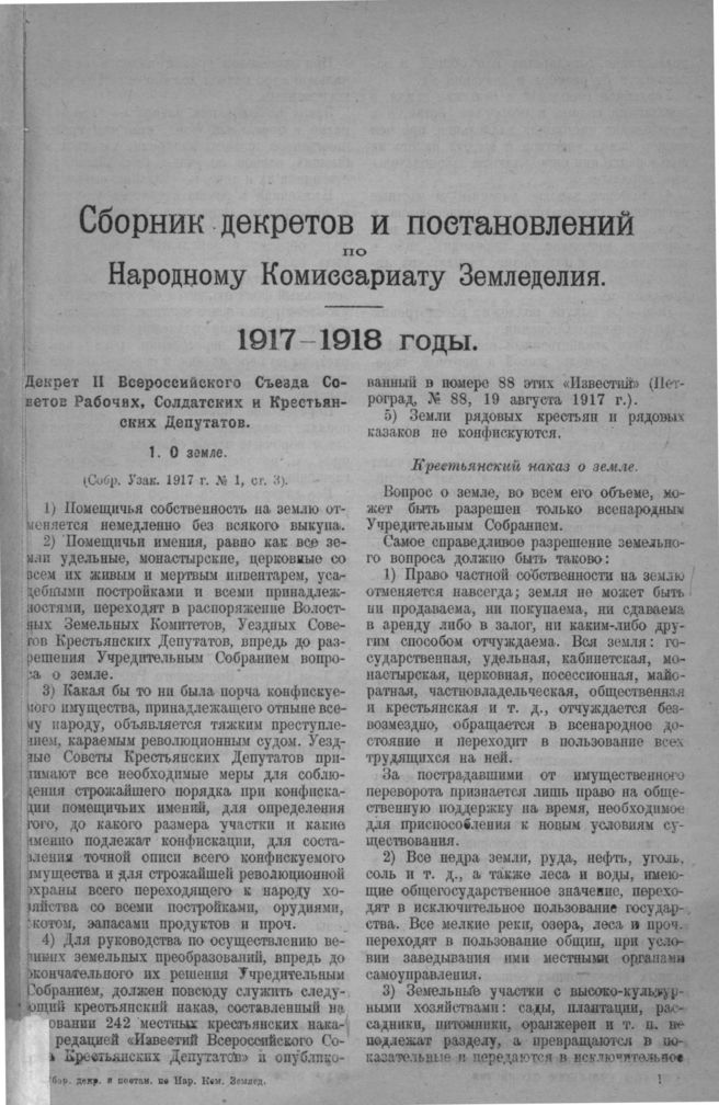 Декрет II Всероссийского Съезда Советов Рабочих, Солдатских и Крестьянских Депутатов. О земле. 26 октября 1917 года // Собр. Узак. 1917 г. № 1, ст. 3. Распубликован в № 1-ом Газеты Временного Рабочего и Крестьянского Правительства от 28 октября 1917 г.