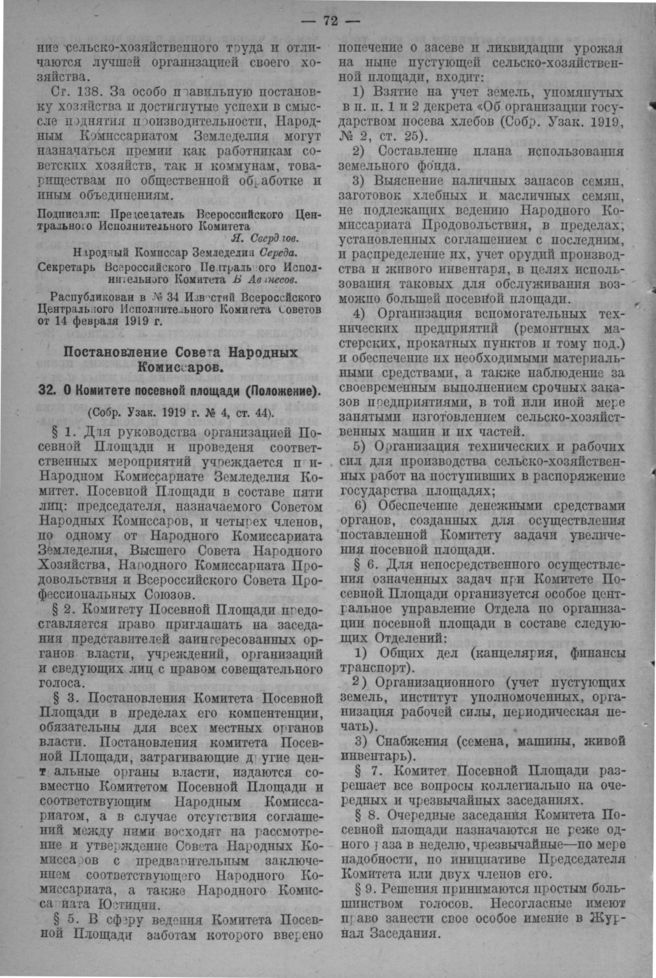 Постановление Совета Народных Комиссаров. О Комитете посевной площади (Положение). 22 февраля 1919 года // Собр. Узак. 1919 г. № 4, ст. 44. Распубликовано в № 44 Известий Всероссийского Центрального Исполнительного Комитета Советов от 26 февраля 1919 г.