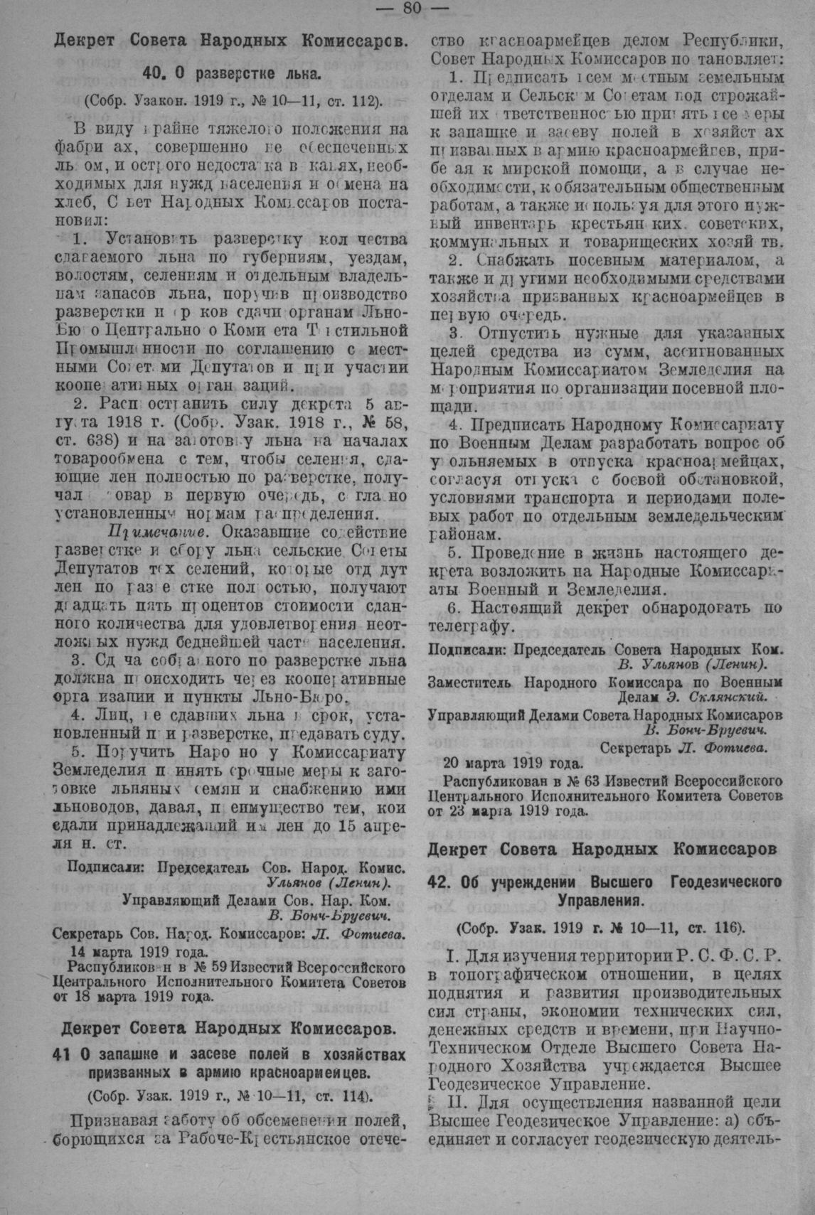 Декрет Совета Народных Комиссаров. О запашке и засеве полей в хозяйствах призванных в армию красноармейцев. 20 марта 1919 г. // Собр. Узак. 1919 г., № 10-11, ст. 114. Распубликован в № 63 Известий Всероссийского Центрального Исполнительного Комитета Советов от 23 Mapтa 1919 года.