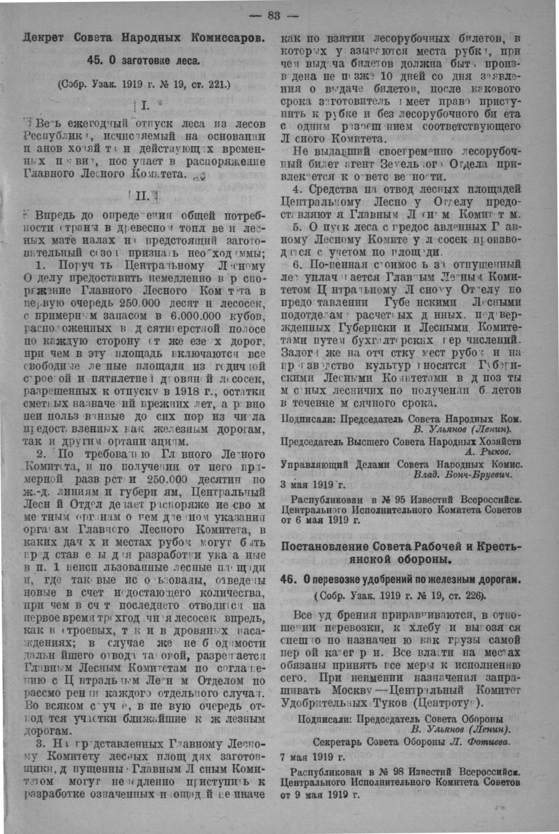 Постановление Совета Рабочей и Крестьянской обороны. О перевозке удобрений по железным дорогам. 7 мая 1919 г. // Собр. Узак. 1919 г. № 19, ст. 226. Распубликован в № 98 Известий Всероссийск. Центрального Исполнительного Комитета Советов от 9 мая 1919 г.