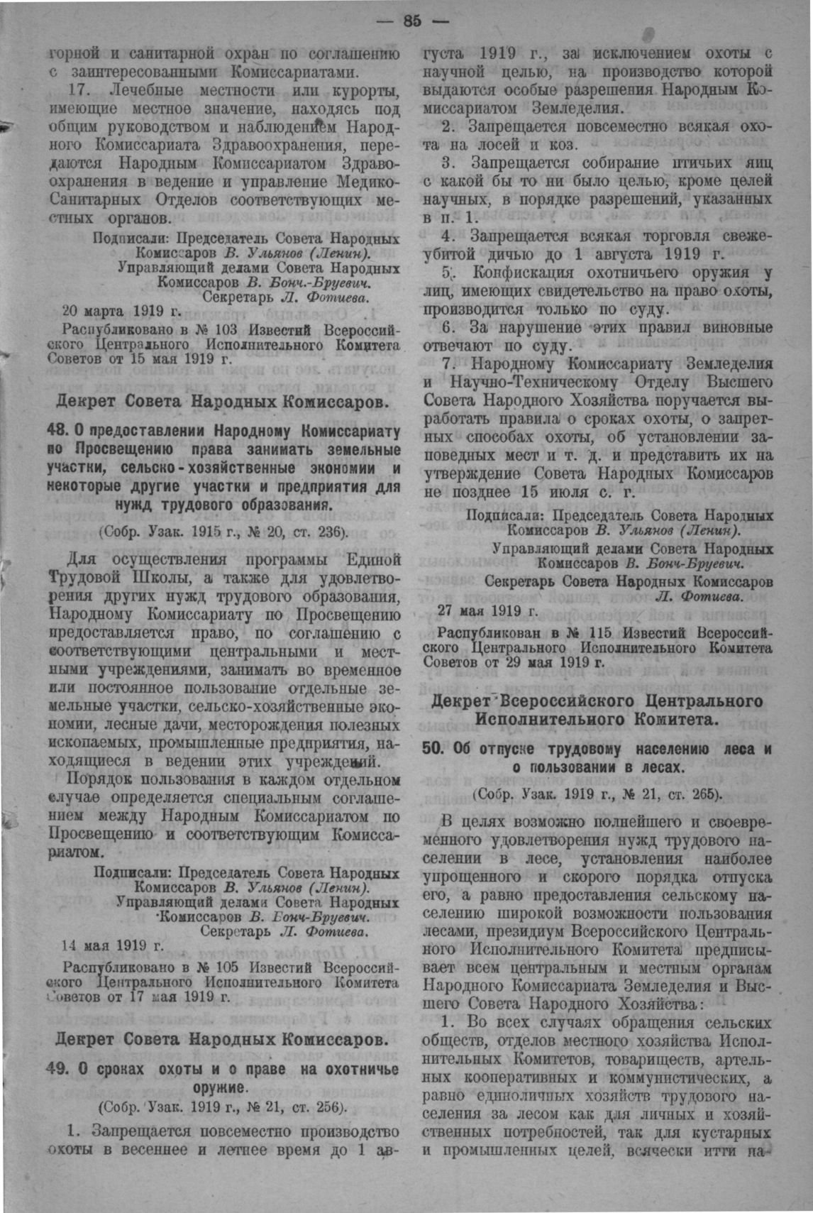 Декрет Совета Народных Комиссаров. О сроках охоты и о праве на охотничье оружие. 27 мая 1919 г. // Собр. Узак. 1919 г., № 21, ст. 256. Распубликован в № 115 Известий Всероссийского Центрального Исполнительного Комитета Советов от 29 мая 1919 г.