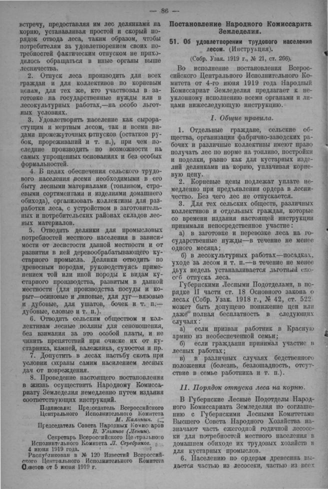 Постановление Народного Комиссарита Земледелия. Об удовлетворении трудового населения лесом. (Инструкция) // Собр. Узак. 1919 г., № 21, ст. 266.