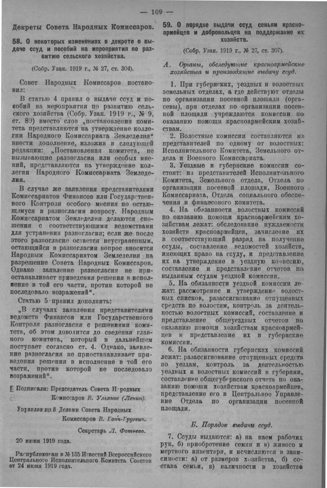 О порядке выдачи ссуд семьям красноармейцев и добровольцев на поддержание их хозяйств. 23 июня 1919 г. // Собр. Узак. 1919 г., № 27, ст. 307. Распубликован в № 136 Известий Всероссийского Центрального Исполнительного Комитета Советов от 25 июня 1919 года.