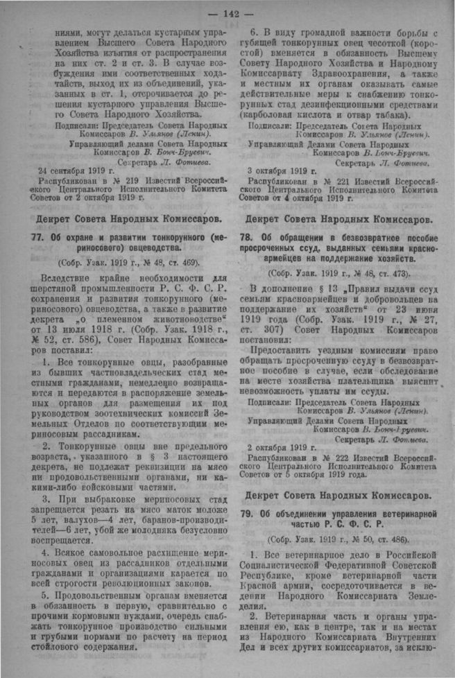 Декрет Совета Народных Комиссаров. Об обращении в безвозвратное пособие просроченных ссуд, выданных семьями красноармейцев на поддержание хозяйств. 2 октября 1919 г. // Собр. Узак. 1919 г., № 48, ст. 473. Распубликован в № 222 Известий Всероссийского Центрального Исполнительного Комитета Советов от 5 октября 1919 года.