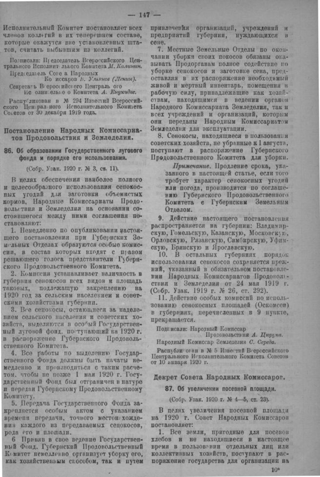Декрет Совета Народных Комиссаров. Об увеличении посевной площади. 17 января 1920 г. // Собр. Узак. 1920 г. № 4-5, ст. 23. Распубликован в № 15 Известий Всероссийского Центрального Исполнительного Комитета Советов от 24 января 1920 года.