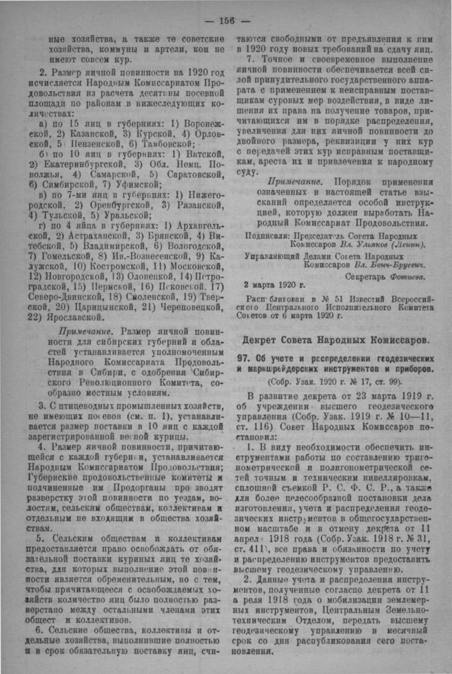 Декрет Совета Народных Комиссаров. Об учете и распределении геодезических и маркшрейдерских инструментов и приборов. 17-го февраля 1920 г. // Собр. Узак. 1920 г. № 17, ст. 99. Распубликован в № 53 Известий Всероссийского Центрального Исполнительного Комитета Советов от 12 марта 1920 года.