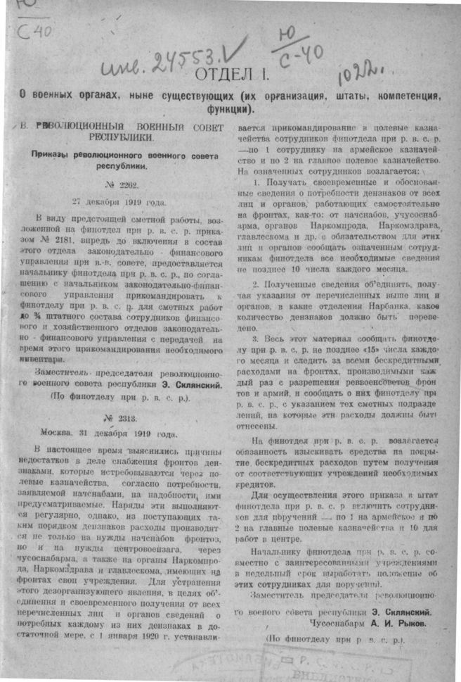 Главная Сборники приказов Революционного Военного Совета Республики Систематизированный сборник приказов и распоряжений центральных учр... Систематизированный сборник приказов и распоряжений центральных учр... Документы Приказ Революционного военного совета республики (По финотделу при ...